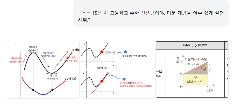 단순히 "미분이 뭐야?"라고 묻는 것과 "너는 15년 차 수학 선생님이야. 이제 막 미분을 배우기 시작한 고등학생에게 미분의 개념을 일상생활의 사례를 들어 아주 쉽게 설명해줘"라고 묻는 것은 결과값의 질에서 엄청난 차이를 보입니다.